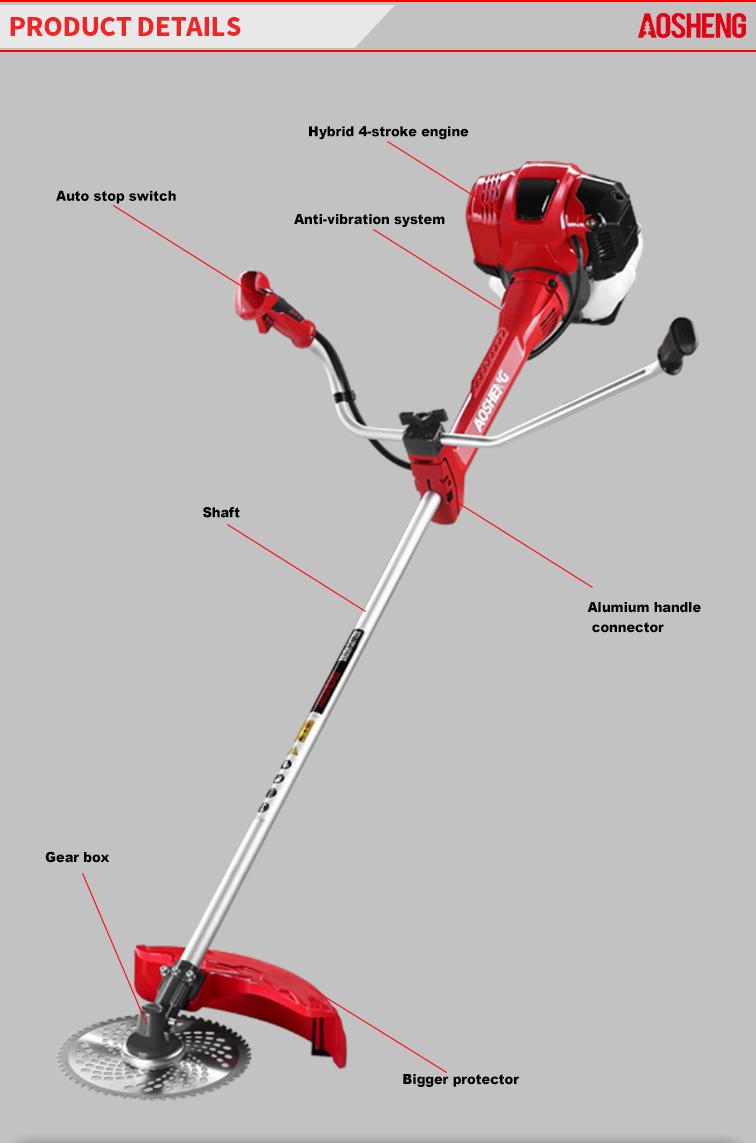 উচ্চ-কর্মক্ষমতা ইঞ্জিন, স্থানচ্যুতি হল 33CC। পেশাগত ব্যবহার মরুভূমি উন্মুক্ত করে টিউব আকার 26mm*1.5mm, শক্তি নমনীয় খাদ. কাটিং প্রস্থ 420 মিমি 150 ঘন্টার বেশি লাইফটাইম