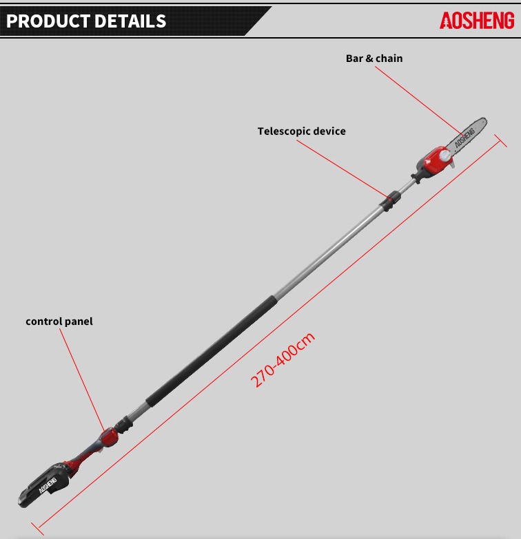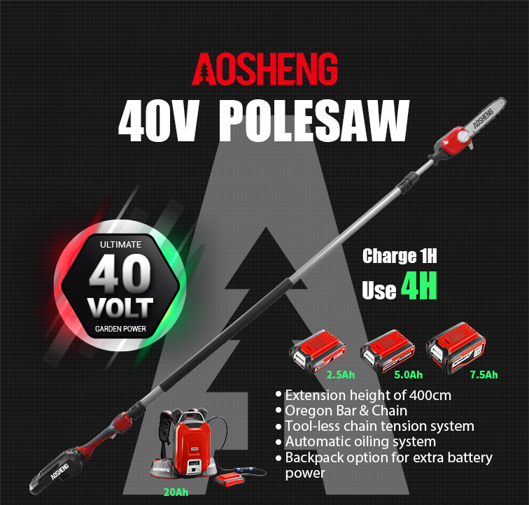 400cm এর এক্সটেনশন উচ্চতা ওরেগন বার এবং চেইন টুল-লেস চেইন টেনশন সিস্টেম স্বয়ংক্রিয় তেল ব্যবস্থা অতিরিক্ত ব্যাটারি পাওয়ার জন্য ব্যাকপ্যাক বিকল্প